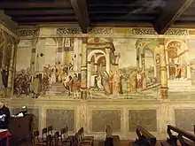 Adjacent to the basilica is a 15th-century cloister and a small prayer hall of the confraternity of the Carmine, known as the Scuola or Scuoletta del Carmine. It has splendid 16th century frescoes, including: