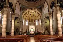 The Romanesque Revival edifice was designed by architect Henry J. Harks of Cleveland, Ohio.[1] Architect Chris Vierheilig of Grand Rapids supervised its construction. The exterior walls of the basilica are covered in limestone from Sandusky, Ohio and it is trimmed in Bedford limestone. The two towers that flank the façade are 134 feet (41 m) high and the large central dome rises to 134 feet (41 m) above the ground.[1] The dome reflects Byzantine influence while the facade's large rose window reveals Gothic influence. The basilica's stained glass windows were designed by A. Artmaier and created by craftsmen from Munich, Germany. Edmund Verlinden designed the altars, pulpit, baptismal font, and confessionals. The original communion rail was topped with Georgia marble. The pews were crafted by the American Seating Company of Grand Rapids, a nod to the city's large furniture industry.
