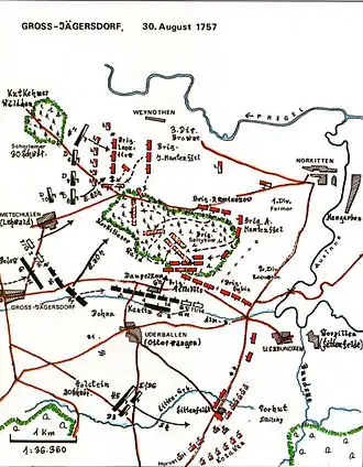 The Russian field marshal Stepan Fyodorovich Apraksin commanded an army of approximately 55,000 men and crossed the Niemen.[11] They captured Memel, which became the army's base for an invasion of the rest of Prussia. Apraxin was cautious, however, and inexperienced in wartime measures. Instead of marching on Wehlau, as was expected, he ordered his forces to cross the Pregel River in safety, near the village of Gross-Jägersdorf. The position in East Prussia had stretched the Russian supply lines, and the troops were forced to forage. Foraging quickly degenerated into unruliness and turned into a scorched earth policy, a process that Frederick derided, thinking the Russians undisciplined troops; a disciplined army, the King reasoned, would make quick work of them.[12] They moved on Königsberg, to try to take or at least invest the city.[13] Frederick sent his 70-year-old Field Marshal Hans von Lehwaldt, who commanded of forces in East Prussia, with 28,000 men; he supplied Lehwaldt with one hundred officers' patents to fill as he saw fit, expecting him to strengthen the army there.[14][15] He also sent ambiguous orders to take on the Russians whenever his field marshal saw fit. Frederick had not given him specific instructions, just general ones to act when the moment seemed propitious.[16]