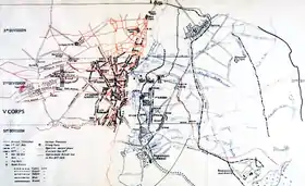 On 11 June, Castelnau gave orders that the gains since 7 June were to be consolidated, ready to continue operations towards Serre.[32] The Germans used the lull to dig in and relieve tired units but care was taken to leave no trace for French balloon and aircraft observers to see. It was believed that the HQ of III Battalion, RIR 111 (Oberstleutnant von Ley) had been identified this way and destroyed by French artillery. RIR 111 began a new trench west of Serre but the digging was spotted by the French and the area bombarded until 12 June. A plan was laid for a counter-attack in Sector S6 near the Mailly-Maillet–Serre road by Regiment Krause (I and II battalions IR 185, 185th Division), Regiment Heiden (II Battalion, RIR 109, 28th Reserve Division and I Battalion, IR 186 of the 185th Division) and a battalion from BRIR 15. The troops assembled at 1:30 a.m. with RIR 109 leading the attack 66 ft (20 m) in front of the second wave, which was to mop up 98 ft (30 m) in front of the third wave, which carried trench stores to consolidate the captured ground. The attack began at 2:00 a.m. but was exposed by flares and searchlights and subjected to massed small-arms fire, particularly on the right (northern) flank. The first wave found the French trench empty and assumed that the French had run away. A grenade fight began and when two red flares were set off in the French lines, the French artillery replied with an hour-long bombardment. The German infantry got lost in the maze of trenches, which did not correspond to their maps and the troops retreated to Beaucourt less one platoon, left behind to receive stragglers and to link the trenches south of the road with those west of Serre.[33]