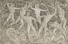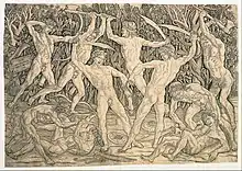 The Battle of the Nudes or Battle of the Naked Men,[1] probably dating from 14651475, is an engraving by the Florentine goldsmith and sculptor Antonio del Pollaiuolo which is one of the most significant old master prints of the Italian Renaissance. The engraving is large at 42.4 × 60.9 cm, and depicts five men wearing headbands and five men without, fighting in pairs with weapons in front of a dense background of vegetation.