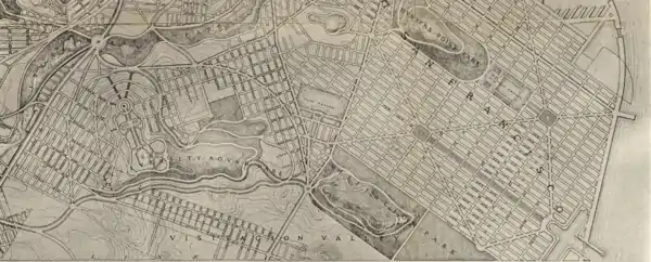 Burnham proposed the land (from the hill extending to the Bay) should be set aside as a park he named Visitacion Park in a report submitted to the Board of Supervisors in September 1905.[25] In the wake of the April 1906 earthquake and fire, however, Burnham's plans were shelved. The park was created in 1915.[11] Burnham's plans also called for a neighboring University Mound Park,[25] which became John McLaren Park in 1926.