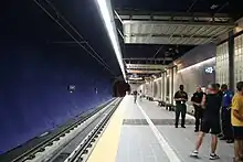 Beacon Hill station was designed by architectural firm Otak and built by a joint venture between engineering firms Hatch Mott MacDonald and Jacobs Engineering Group.[57][58] The station building houses entrances to four high-speed elevators that travel 160 feet (49 m) to platform level in 20 seconds.[2][59] Beacon Hill's 400-foot-long (120 m) split island platform is located between the two Beacon Hill Tunnel tubes, with a small cross-tunnel passageway between the two sections of the platform.[60] It serves 1 Line's two tracks; the northbound tracks serves trains to Northgate, while the southbound tracks serves trains to Angle Lake. As with all Link stations, electronic information signs above the platform offer real-time information about train arrivals and service alerts, in addition to announcements over an intercom. Beacon Hill's bus stops are located south of the station building on Beacon Avenue, with the northbound stop located adjacent to the station and the southbound stop accessible via a signaled crosswalk. The station does not include public parking, but is within walking distance of several private parking lots that require payment. ORCA card vending machines are located outside the station building, along with bicycle lockers and a bicycle cage with space for 48 bicycles.[3][61] Emergency staircases and the ventilation shaft are capped by the east headhouse, located behind the station building and plaza on South Lander Street.[62]