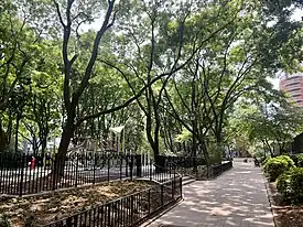Bellevue South Park is a 1.59-acre (0.64 ha) public park in the Kips Bay neighborhood of Manhattan, New York City.[1] Located on the west side of Mount Carmel Place between East 26th and 28th streets, the park was originally planned as part of the Bellevue South Urban Renewal Area approved by New York City in 1964. The park did not open until 1979 due to a lack of municipal funding during the city's fiscal crisis and local community groups were originally responsible for the park's upkeep before maintenance was transferred over to the New York City Department of Parks and Recreation in 1986.