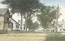 Originally known as "Upper Gilmanton", Belmont was chartered in 1727 as a parish of Gilmanton. With water power from the Tioga River, it developed as a mill town.[3] Built in 1833, the Gilmanton Village Manufacturing Co. made cotton and woolen textiles. Over the years it would change owners, names and products. In 1921, it was the Belmont Hosiery Co., a maker of silk, lisle and woolen stockings. It went out of business in 1955, and the renovated mill building is now a community center.[3]