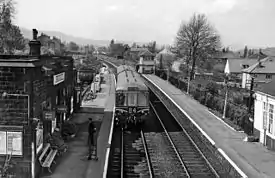 The station has two through-platforms linked by a footbridge.[2][3] The footbridge is not wheelchair accessible but there is level access to both platforms from separate streets. There is a small station car park with around twenty spaces.[4] There is a public address system, electronic displays on both platforms and both platforms have a passenger shelter. The station is unstaffed and the former station buildings are now in private use.