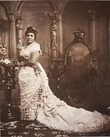 Liliʻuokalani (Hawaiian pronunciation: [liˌliʔuokəˈlɐni]; September 2, 1838 – November 11, 1917) was the first queen regnant and last sovereign monarch of the Kingdom of Hawaiʻi. After King Kalākaua's brother and heir apparent Leleiohoku II died April 9, 1877, he proclaimed his sister Liliʻuokalani to be his successor.[1] Upon his 1891 death, she ascended to the throne, ruling from January 29, 1891, until the overthrow of the Kingdom of Hawaiʻi on January 17, 1893.