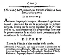 To fill the requirement with an equalitarian national award, the National Convention developed the practice of passing resolutions by vote, solemnly stating that a deserving citizen, or group of citizen, had Bien mérité de la Patrie. These resolutions were published in Le Moniteur Universel, in a manner similar to being mentioned in dispatches.