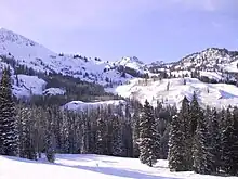 Big Cottonwood Creek is located in the Wasatch Mountains just east of Salt Lake City. It is part of the Big Cottonwood Creek Watershed, which ranges in elevation from 5,000 to 10,500 feet with the headwaters around 9,600 feet.[3] The creek flows through the Big Cottonwood Canyon in a westerly direction until it emerges into Salt Lake Valley about eighteen miles (29 km) from its highest source. Thence its course is northwesterly through Cottonwood Heights, Holladay, and Murray, Utah for a little over twenty-four miles miles from the headwaters (39 km) until it empties into the Jordan River about five miles (8.0 km) south of Salt Lake City.[3] The water eventually flows into the Great Salt Lake. In the summer, its waters are all used for irrigation purposes. From its source to its original outlet in the Jordan River is about twenty-six miles.[4]