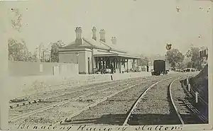 On Sunday 22 April 1883, the original wooden station building was destroyed by fire.[2][3] A coroner's inquest failed to find a cause of the fire despite hearing evidence from many witnesses. Special praise was given to a young fettler, William Nettleton, who bravely risked injury to save three chairs.[4][5] Just over a month later Binalong was celebrating the completion of the brickwork of the new, sturdier station. George Reynolds, the bricklayer, was toasted by the attendees for his work. The celebratory atmosphere also saw toasts to the Queen, the district engineer, the inspector, the carpenters, the Press and the station master and his wife; Mr and Mrs Rae.[6]