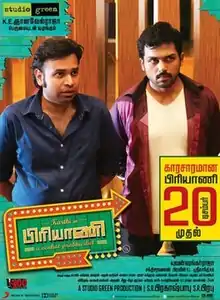 Biriyani is a 2013 Indian Tamil-language action comedy thriller film directed by Venkat Prabhu and produced by Studio Green.[1][2][3][4] It stars Karthi and Hansika Motwani alongside an ensemble cast including Premji, Nassar, Ramki, Sampath Raj, Madhumitha, Jayaprakash, Prem, and Mandy Takhar. Yuvan Shankar Raja composed the score and soundtrack of Biriyani, which marks his 100th film, while Sakthi Saravanan and Praveen-Srikanth handled cinematography and editing, respectively.