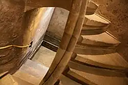A spiral staircase leads down to the vault, built in Renaissance style, that dates to the last quarter of the sixteenth century.[2] The staircase has been completely renovated.[4] It is about 7.5 metres (25 ft) in height, with a cloakroom halfway down about 7 square metres (75 sq ft) in area. There are niches in the wall to hold candles or oil lamps. The bath itself is dug into alluvial ground over 8.5 metres (28 ft) below ground level, fed by groundwater. Heavy rains and periods of high water provide clear water to the bath. There are two holes in the vaulted ceiling that allow for addition of hot water to slightly warm the 500 litres (110 imp gal; 130 US gal) of water. The bath room is about 4 metres (13 ft) from the base of the tank to the ceiling.[2]