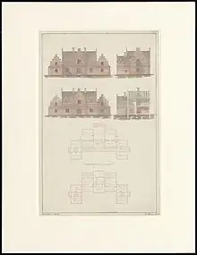 The Bishop's House in Nyjøbing was constructed by Gottlieb Bindesbøll in 1850 at the initiative of Ditlev Gothard Monrad. It was a 15-bays single-storey building with crow-stepped gables. The central bay of the facade that faced the garden was also tipped by a crow-stepped gable. The western end of the building contained his office and other representative functions.[1]