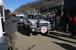 ICRC vehicle facilitating the transfer of a patient in need of urgent medical assistance across the Lachin road to Armenia.[246]