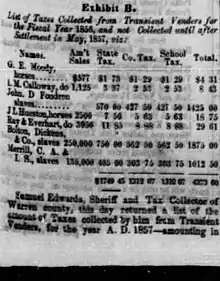 - ↑ "List of taxes collected from transient venders for the fiscal year 1856". Vicksburg Daily Whig. 1858-05-15. p. 3. Retrieved 2023-12-20.