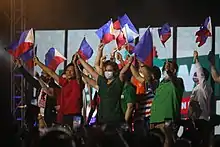 Marcos' messaging is centered on nationalism and uniting the country, emphasizing the need for unity to recover from the pandemic.[6][37] His campaign slogan, "Sama-sama tayong babangon muli" (Together, we shall rise again), also reflects this message.[3] The colors predominantly used by the campaign are red and green; red is associated with the Kilusang Bagong Lipunan, the party of former president Ferdinand Marcos, his father, while green is the campaign color of Duterte.[38] Supporters of the tandem also use the V sign, which symbolizes political victory and is associated with the Marcos family.[39] Aside from the clenched fist, that was the hand sign of her father, Sara Duterte also had her own hand symbol, her right hand on her chest. This is derived from her slogan "Mahalin Natin ang Pilipinas" (Let's love the Philippines). Songs frequently used during the campaign include "Umagang Kay Ganda" by Butch Monserrat and the New Society era song "Bagong Pagsilang" by Levi Celerio.[40][41]