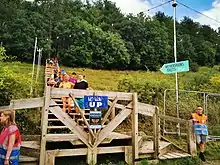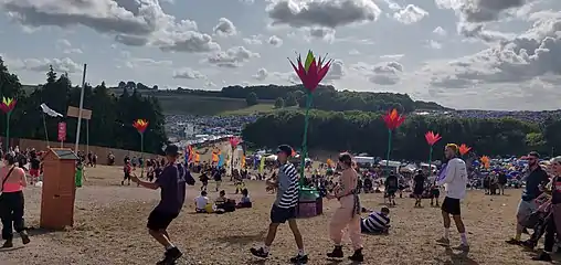 The fair is situated at grid reference SU 52919 28297. The site is split into 3 areas: the Downtown area is contained within the Matterley Bowl, the natural valley Temple Valley features the area of the same name, and the Hilltop area extends across the crest of the hill that is the mid-ground between these two areas – it is also the geographical centre of the site.[27] The site is divided by the steep hill between the Downtown and Hilltop areas with participants taking either Hippie Highway or The Stairs to travel between the two. A number of stages feature within the natural features of the sites. The Hidden Woods, Tribe of Frog, Tangled Roots and Psychedelic Forest stages are set within forests under tree canopies. The Lions Den stage is also set within a natural amphitheatre.