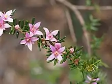 Boronia boliviensis, commonly known as Bolivia Hill boronia[2] is a plant in the citrus family, Rutaceae and is endemic to a small area on the Northern Tablelands of New South Wales. It is a strongly scented shrub with pinnate leaves, deep pink flowers in spring and with its young branches covered with fine, yellow hairs. It is only known from higher parts of the Bolivia Range where it grows on granite outcrops.