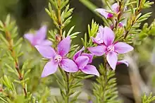 Boronia falcifolia, commonly known as the wallum boronia,[2] is a plant in the citrus family, Rutaceae and is endemic to near-coastal areas of eastern Australia. It is a shrub with only a few stems, usually three-part leaves and bright pink, four-petalled flowers.