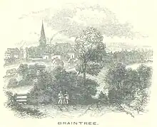Braintree is a town in Essex, England. The principal settlement of Braintree District, it is located 10 miles (16 kilometres) northeast of Chelmsford, 35 miles (56 km) northwest of Southend-on-Sea, and 15 mi (24 km) west of Colchester. According to the 2021 Census, the town had a population of 43,492, while the urban area, which includes Great Notley, Rayne, Tye Green and High Garrett, had a population of 55,792.[1]