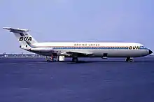 In early 1961, BUA applied to the Air Transport Licensing Board (ATLB),[35][36][37] a predecessor of the Civil Aviation Authority (CAA), for a large number of domestic and international short-, medium- and long-haul scheduled route licences to give its scheduled network the critical mass to become financially viable by 1965, and to provide sufficient work for a planned £20 million fleet of new jets comprising four long-haul Vickers VC10s and five short-/medium-haul DH 121 Tridents. BUA's applications included a request for twice-weekly all-economy/colonial coach class flights linking Gatwick with Istanbul, Teheran, Karachi, Delhi, Calcutta, Bangkok and Singapore, with a weekly extension to Hong Kong and Tokyo, respectively. BUA intended to inaugurate its first-ever scheduled services to Asia with DC-6Cs or Britannias, which were to be replaced with the new VC10s at a later stage. The airline planned to charge standard IATA fares on all sectors. In addition, it proposed to offer British residents flying to Singapore and Hong Kong in Skycoach[nb 6] an 18% discount on the equivalent economy class fares.[18][21][22][28][29][30][38][39] In May of that year, BUA became the first independent airline in the UK to launch a brand-new jet aircraft, when it placed an order for ten short-/medium-haul BAC One-Eleven 200 series.[2][40][41][42][43] The same month, the airline placed an order for four Vickers VC10 long-haul jets costing £2.8 million apiece.[44][45][46][47][48][49] Laker personally negotiated these orders with both manufacturers. The combined order value was £20 million.[50] At that time, the ATLB conducted a hearing into BUA's applications for over 20 scheduled route licences to enable it to expand the European network to include a number of major trunk routes from its Gatwick base, such as Gatwick to Paris, Milan, Zürich, Amsterdam and Athens, in competition with existing services of BEA from Heathrow.[30][51] Although the ATLB granted BUA the requested licences for 12 of these routes, the airline was unable to use them without actual traffic rights.[52] [53] These needed to be negotiated on its behalf between the UK Government and its overseas counterparts.[53][54] Following the ATLB's decision, BUA commenced scheduled services between Gatwick and Tenerife in October 1961 using Viscounts.[55][56][57] The same month, the airline started Viscount trooping flights from Gatwick to Germany under contract to the MoD.[58][59]