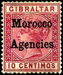 The stamps were overprinted "Morocco / Agencies" beginning in 1898, initially at the offices of the Gibraltar Chronicle,[1] and then later in London, yielding several variations in the appearance of the overprint.