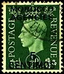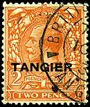 The Tangier International Zone received its own overprints beginning in 1927. As British currency was in use in that office, the overprint simply reads "TANGIER". This continued through 1956. On 1 April 1957, a commemorative overprint added "1857-1957" to celebrate the 100th anniversary of the post office, but this had a very short shelf life; the office at Tangier was closed and the stamps withdrawn from sale on 30 April 1957.[3]
