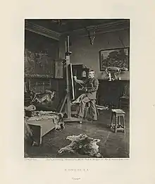His first pictures appeared at the British Institution, and in 1857 he exhibited three works at the Royal Academy, but it was not until 1863 that he became a regular contributor to the Academy exhibitions. In that year he was represented by The eve of the Spanish Armada, and in 1864 by a Romeo and Juliet. However, subjects of this kind did not attract him long, for in 1865 he began, with Sleeping Deerhound, a series of paintings of animal-subjects which occupied much of the rest of his life.[2] In a lengthy interview in Chums Boys Annual, entitled "How I paint animals", Rivière explained some of the practicalities of painting both tame and wild animals: