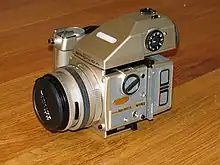 - ETR: Introduced March 1976,[6] production discontinued March 1980.[9] Advanced, compact, modular electronic 6x4.5 cm medium-format SLR camera system with a vast array of finders, film-backs, and other accessories. ETR was an acronym for Electronic, TTL-metering, Reflex. In 1977 the ETR received Japan's Good Design Award. Seventeen lenses with leaf shutters were made for the ETR-system from a fisheye, to four different zooms, to a 500mm super telephoto, to a unique 55mm tilt shift lens.