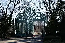 The Bronx Zoo (also historically the Bronx Zoological Park and the Bronx Zoological Gardens) is a zoo within Bronx Park in the Bronx, New York. It is one of the largest zoos in the United States by area and is the largest metropolitan zoo in the United States by area,[5] comprising 265 acres (107 ha) of park lands and naturalistic habitats separated by the Bronx River. On average, the zoo has 2.15 million visitors each year as of 2009.[5] The zoo's original permanent buildings, known as Astor Court, were designed as a series of Beaux-Arts pavilions grouped around the large circular sea lion pool.[6] The Rainey Memorial Gates were designed by sculptor Paul Manship in 1934 and listed on the National Register of Historic Places in 1972.[7]