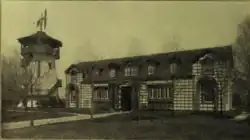 When the farmhouse was built some years before the school opened, Belmont gave it the attention that she bestowed on the family mansion. Excellent architects were employed. The architecture inclined to the English, but the interior was decidedly Dutch, with low, beamed ceilings, oak presses built in the wall, and the entrance hall done in blue tiles painted from Belmont's own sketches. She combined sanitation with artistic merit, as evidenced by a large, light, well-appointed kitchen and the designs of horse trough, seats for resting, and fencing around the barnyard court. The other two sides of the large yard were enclosed by the wagon houses, barns and dairy, where the girls learned the care of milk and butter making, while the hives of Italian bees were sheltered from the wind.[2]