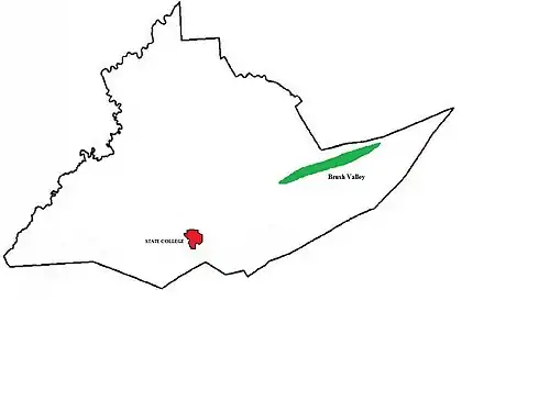 Brush Valley is a southwest to northeast narrow valley of the Ridge-and Valley Province of the Appalachian Mountains in central Pennsylvania. The valley is bordered by Nittany Mountain to the north and Brush Mountain to the south in Gregg and Miles Townships in eastern Centre County. The main route of travel through the valley is PA Route 192 which starts at Centre Hall and travels the entirety of the valley before the valley ends near the village of Livonia in the Bald Eagle State Forest near R.B. Winter State Park.[1] The valley is a little over 16 mi (26 km) in length and averages around 1 mi (1.6 km) in width. At its widest point it reaches only around 1.5 mi (2.4 km).