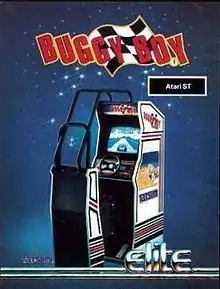 Buggy Boy,[lower-alpha 1] known as Speed Buggy in North America,[3] is an off-road racing game developed by Tatsumi and released for arcades in 1985. The cockpit version of the arcade cabinet has a panoramic three-screen display, a feature previously employed in TX-1, but with Buggy Boy having a larger cabinet.[4] An upright, single-screen cabinet was released in 1986 under the name Buggy Boy Junior.
