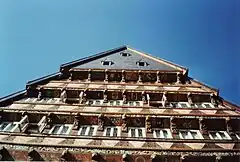 The Butcher's Guild Hall, an example of half-timbered building, is one of the largest structures in the Historic Market Place of Hildesheim. With its 7 floors and a height of 26 metres, it is considered to be one of the tallest half-timbered houses in Germany. The roof has a dimension of 800 square metres.[1] The portal has a width of 2.35 meters. The façade is decorated with colourful wood carvings, paintings, and German proverbs.
