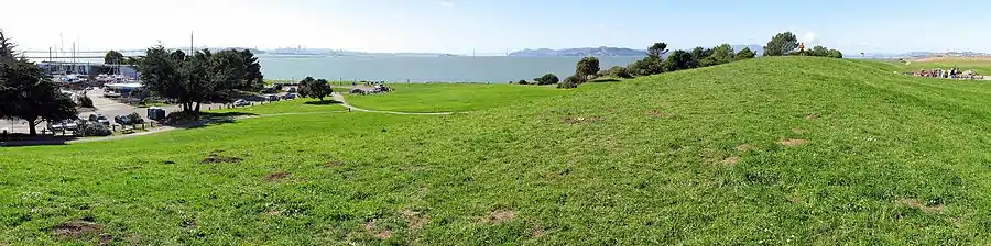 The park's east position in San Francisco Bay provides panoramic views of San Francisco, the Golden Gate Bridge, the Marin Headlands, and the East Bay hills. The park's terrain is characterized by very open grassy hills that have become popular for kite flying.[2] Paved paths run the perimeter and throughout the park where picnic tables and barbecue grills are available to the public.