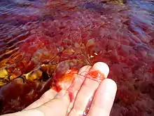 Caño Cristales river has a wide variety of aquatic plants. The water of the river is extremely clear due to the lack of nutrients and small particles. Almost unique is the bright red - pink coloration of the riverbed after the rainy period from the end of June till November. This color is caused by great quantities of plant species Rhyncholacis clavígera (often known by its former name, Macarenia clavigera). This plant is only found in found in Caño Cristales and a few others rivers in the region, such as the Caño Siete Machos. These plants, which are green when young, then turn yellowish and finally various shade of red, adhere tightly to rocks in places where the river has faster current.[5][6]