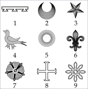 Charges used as marks of cadency in English heraldry: 1: label of three points; 2: crescent; 3: mullet; 4: martlet; 5: annulet; 6: fleur-de-lys; 7: rose; 8: cross moline; 9: octofoil