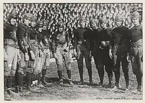 University of California fielded its first American Football team in 1882.[9] In March 1892, the school played its first game against Stanford University. This was the first instance of the annual rivalry match – The Big Game, one of oldest college rivalries in the United States.[10] In 1899, coached by Princeton alumni Garrett Cochran, Cal played a home against future legend Pop Warner and the emerging power of that period the Carlisle Indian Industrial School. Warner took up Cochran's challenge that his undefeated team could beat any East Coast opponent.[11] The game took place in San Francisco on Christmas Day of that year. Even though Carlisle dominated the majority of its season's opponents, it could only beat Cal 0–2, via a second-half safety. It was after that match that Cal became considered a worthy opponent to the East Coast teams.[11] The 1900 Big Game is associated with the Thanksgiving Day disaster. The match took place in San Francisco, with between 500 and 1,000 men watching the game from the rooftop of an operating glass factory next to the sold-out city stadium. During the game, more than 100 fans fell through the factory's roof with the majority falling onto the factory's massive, operational furnace. In total 22 men, mostly boys were killed, with others severely injured.[12][13]