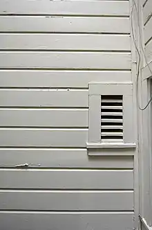 The California cooler is constructed simply as an interior cabinet with slatted or screened shelves. Vents near the top and bottom allow outside air to circulate by the principle of natural convection. This results in convective cooling, which keeps perishable food items fresh. The outside vents are separated from the outside by a screen, preventing the incursion of insects, and downward slanting slats shut out rain.[3] Often on a wall away from sun,[1] they tend to be located near where food is prepared, such as in the kitchen. Modifications to work in more variable climates, such as a trap door to selectively draw air from a cellar,[2] are possible.
