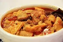 Callos a la Madrileña is a stewed tripe dish, cooked slowly for hours over low heat, that is a speciality of Spanish cuisine associated with the city of Madrid. Traditionally pig or cow tripe was used but modern recipes use lamb or even cod. It includes pig snout and trotters, black pudding, sausage, ham, and soup vegetables like carrots and onions.[1] When prepared correctly the broth is rich in gelatin and the tripe becomes very tender after the slow cooking process. The tripe can be browned before the cooking liquid is added, with trotter's, oxtails and other ingredients for the soup like ham, chorizo and smoked paprika.[2] It is common to serve this stew with the morcilla blood sausage, a tapas dish typical of the region of Castile and León.[3]