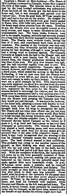 The club's best Scottish Cup run came in 1888–89, with the club reaching the quarter-final; ironically it proved to be deleterious for the club, as following the season it suffered a number of departures as players were poached by quasi-professional or English clubs,[14] star forward William Dempsey for instance moving to Hibernian.[15] The highlight of the run was a 3–1 win over Heart of Midlothian, but in the quarter-final the 3rd L.R.V. proved too strong, Alex Kain scoring the only Campsie goal in a 6–1 defeat at Cathkin Park.[16]