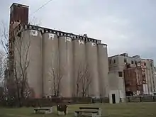 The Canada Malting complex was designed by David Jerome Spence, and was built in 1904.[1] On the west side of the complex there are nine violet colored silos. They are covered in treated clay tiles that were manufactured by the Barnett and Record Co. of Minneapolis. These silos are rare examples of using this technique to cover and insulate silos. The cement silos on the other side were added in the 1940s, and were used to store the barley used to produce the malt. The barley was germinated and dried in the buildings that lined Saint-Ambroise Street.[2] The factory had an output of 250,000 pounds (110,000 kg) of malt per year, and distributed it to distilleries and breweries.[1] The closing of the Lachine Canal in 1970 forced the company to transport its malt by train only, and around 1980, the building was actually too small and the transportation costs too high, so the company abandoned the site and moved into a new malting complex located at 205 Riverside and Mill Street, Montreal.[1][3] The building was then sold for $500,000 and became a soya and corn storage facility for Quonta Holding Ltd, before it was abandoned in 1989 when Canadian National ceased its rail line service to factories in this area of the canal.[1] The ancient clay silos are now protected as part of the Lachine Canal National Historic Site. They have been so battered from both the elements and vandalism, that it is no longer possible to restore them.[1]