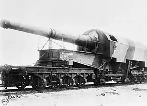 The carriages consisted of a large rectangular steel base, which was suspended on two four-axle railroad bogies manufactured by Schneider.[2] The number of axles was determined by the weight limit for European railways of 17 tonnes per axle.[3] Rather than having a separate ammunition wagon the guns featured a one- piece design where the breach of the gun and its ammunition were combined in an armored cab on the rear bogie. This was intended to give the gun crews protection from shell splinters and gunfire but the cab was cramped and lacked ventilation. This also restricted the angle of elevation to +25° and limited the range of the guns to 22 km (14 mi).[2]