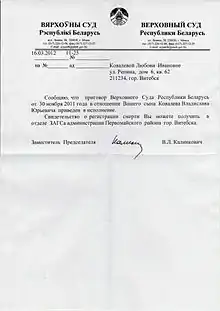 - ↑ "Authorities keep torturing death convict's mother". Viasna Human Rights Centre. Minsk. November 24, 2014. Archived from the original on August 31, 2022. Retrieved August 31, 2022.