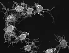 C. owczarzaki cells, in the filopodial stage, were described as 3 to 5 μm amoebas with a nucleus ⅓ - ½ of the diameter of the cell (containing a central nucleolus), long branched filopodia, mitochondria with flattened cristae, numerous phagosomes, lipid vacuoles, glycogen granules and a Golgi apparatus.[6][7] Cystic cells measure 4 to 5 μm with a double wall: the outer thin, irregular and loosely attached; and the inner thicker, smooth.[8]