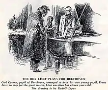 Liszt became Czerny's most famous pupil. He trained the child with the works of Beethoven, Clementi, Ignaz Moscheles and Johann Sebastian Bach. The Liszt family lived in the same street in Vienna as Czerny, who was so impressed by the boy that he taught him free of charge. Liszt was later to repay this confidence by introducing the music of Czerny at many of his Paris recitals.[16] Shortly before Liszt's Vienna concert of 13 April 1823 (his final concert of that season), Czerny arranged, with some difficulty (as Beethoven increasingly disliked child prodigies) the introduction of Liszt to Beethoven. Beethoven was sufficiently impressed with the young Liszt to give him a kiss on the forehead.[17] Liszt remained close to Czerny, and in 1852 his Études d'exécution transcendante were published with a dedication to Czerny.[18]