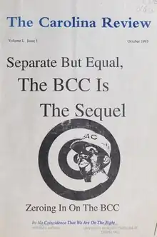 Carolina Review has often opposed many of the progressive reforms that have been put forth on campus. In 1993, the first issue of the Review opposed the construction of the Sonja Hayes Black Cultural Center on UNC's campus, claiming that "on the surface, [the BCC] seems like a good idea. ... It seems the equitable, the conscientious, the, using the liberal buzzword, 'fair' thing to do. Dig a little deeper, however, and you find that not only is it a bad idea, but it goes against the very beliefs of those who fought for civil rights."[2] This stance has been criticized for cultural insensitivity and intolerance towards cultural education.[5]