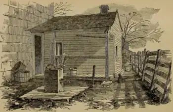The jail was built in 1839, constructed of red limestone quarried nearby. The building is rectangular and measures 29 feet (8.8 m) by 35 feet (11 m). It is a gable-front building has two stories and an attic. Like other county jails built during the same period, Carthage Jail was built to incarcerate petty thieves and debtors and as a temporary holding place for violent criminals. The first floor contained a debtor's room in the northwest corner, and a dungeon, or "criminal cell", was located on the north side of the second floor. The living area for the jailer's family included a kitchen and dining room on the first floor and a bedroom on the second floor. A small "summer kitchen" was added later.[2][3]
