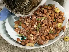 Raw feeding is providing uncooked ingredients to cats.[52] Most of the diet will consist of animal-based ingredients, though fruits, vegetables and supplements are often added.[52] Commercial raw food is mainly sold in three formats: fresh, frozen and freeze-dried.[52] Thawing and rehydration are necessary before feeding frozen and freeze-dried food respectively. Many available commercial diets are AAFCO certified in meeting the nutrient requirements of the cat.[52] Some diets may be formulated for all life stages or they can also be AAFCO certified for adult maintenance or growth and gestation/lactation.[52] Many people feed their cats raw food believing that it mimics the prey diet that wild cats would consume. Firm believers report that such a diet can bring about many health benefits, such as a shinier coat, cleaner teeth and an improved immunity to various gastrointestinal ailments (with diarrhoea and constipation being the most common), as well as an increase in energy and a decrease in bodily waste odours, although no scientific evidence exists to prove these claims.[52]