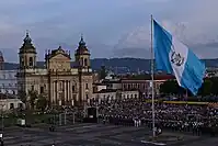 The Holy Church Cathedral Metropolitan Basilica of Santiago de Guatemala also Metropolitan Cathedral, officially Catedral Primada Metropolitana de Santiago, is the main church of Guatemala City and of the Archdiocese of Guatemala (Archidioecesis Guatimalensis).[1] It is located at the Parque Central in the center of the city. Its massive structure incorporates baroque and classical elements and has withstood numerous earthquakes. Damage by the devastating earthquakes of 1917 and 1976 has been repaired. The inside of the cathedral is relatively sparsely decorated but impresses by its size and its structural strength. The altars are ornate and decorative. In front of the cathedral stand a series of 12 pillars, solemnly remembering the names of thousands of people forcibly disappeared or murdered during the counterinsurgency violence of Guatemala's internal armed conflict, which began in 1960 and lasted until the final peace accord was signed in 1996.
